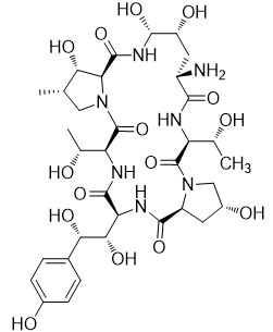 化學(xué)名: (2R,6S, 9S,11R,12R,14aS,15S,16S,20S,23S,25aS)-9-氨基-23-((1S,2S)-1,2-二羥基-2-(4-苯基)乙基)-2,11,12,15-四羥基-6,20-雙((R)-1-羥乙基)-16-甲基十六氫-1H-二吡咯并[2,1-c:2’,1’-1][1,4,7,10,13,16]六氮雜環(huán)二十一烷基)-5,8,14,19,22,25-己酮